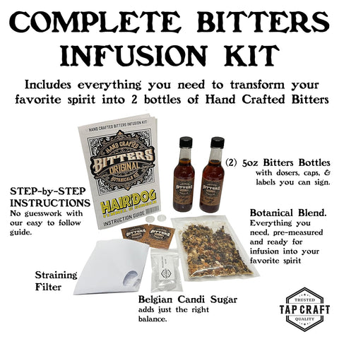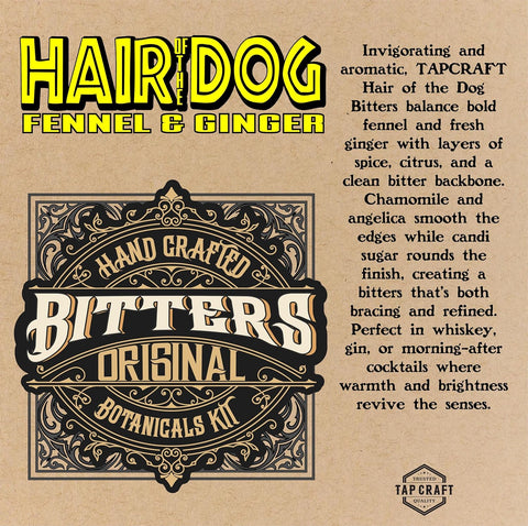 Create your own handcrafted fennel and ginger bitters with this TAPCRAFT DIY Hair of the Dog bitters kit. Built for home bartenders, mixologists, and anyone who enjoys experimenting with bold, herbal flavors, this kit provides everything needed to produce a small batch of aromatic bitters. The botanical blend features fennel seed, ginger root, gentian, angelica, chamomile, warm spices, citrus peel, and classic bittering roots to create a balanced bitters profile with depth and complexity. Simply combine the botanicals with your preferred neutral spirit, steep for one week, strain, sweeten with the included Belgian candi sugar, and bottle using the two included glass bitters bottles.
